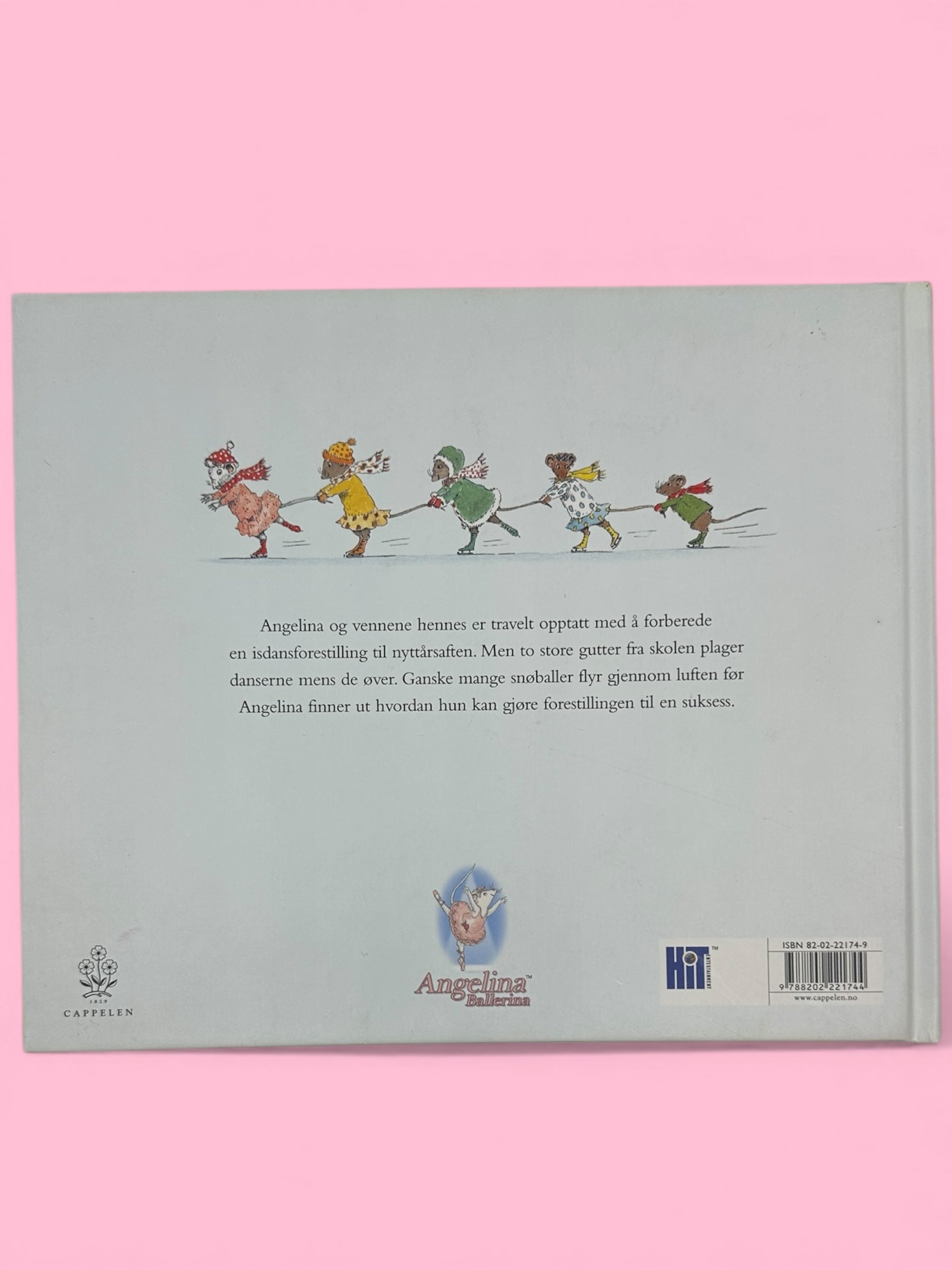 Angelina og vennene hennes holder på å forberede en isdansforestilling på nyttårsaften, men det er to store gutter fra skolen som plager dem. Når de får være med i forestillingen, så blir alt bra. Historien er enkel og nokså dimensjonsløs. Musefigurene i illustrasjonene er heller ikke særlig uttrykksfulle, men detaljrikdommer og den tradisjonelle engelske stemningen i interiørskildringen gjør oppslagene interessante og bærer fremstillingen.