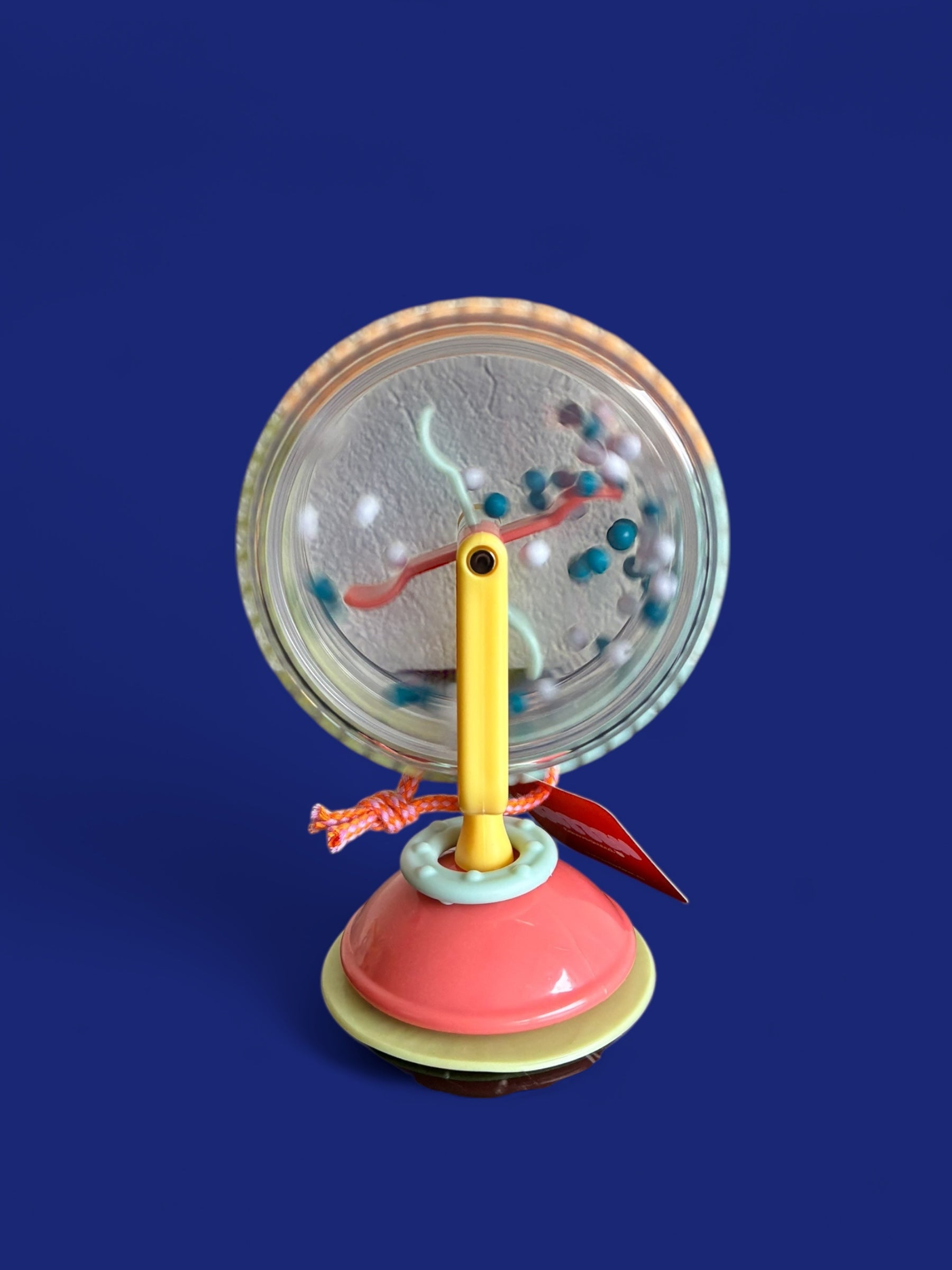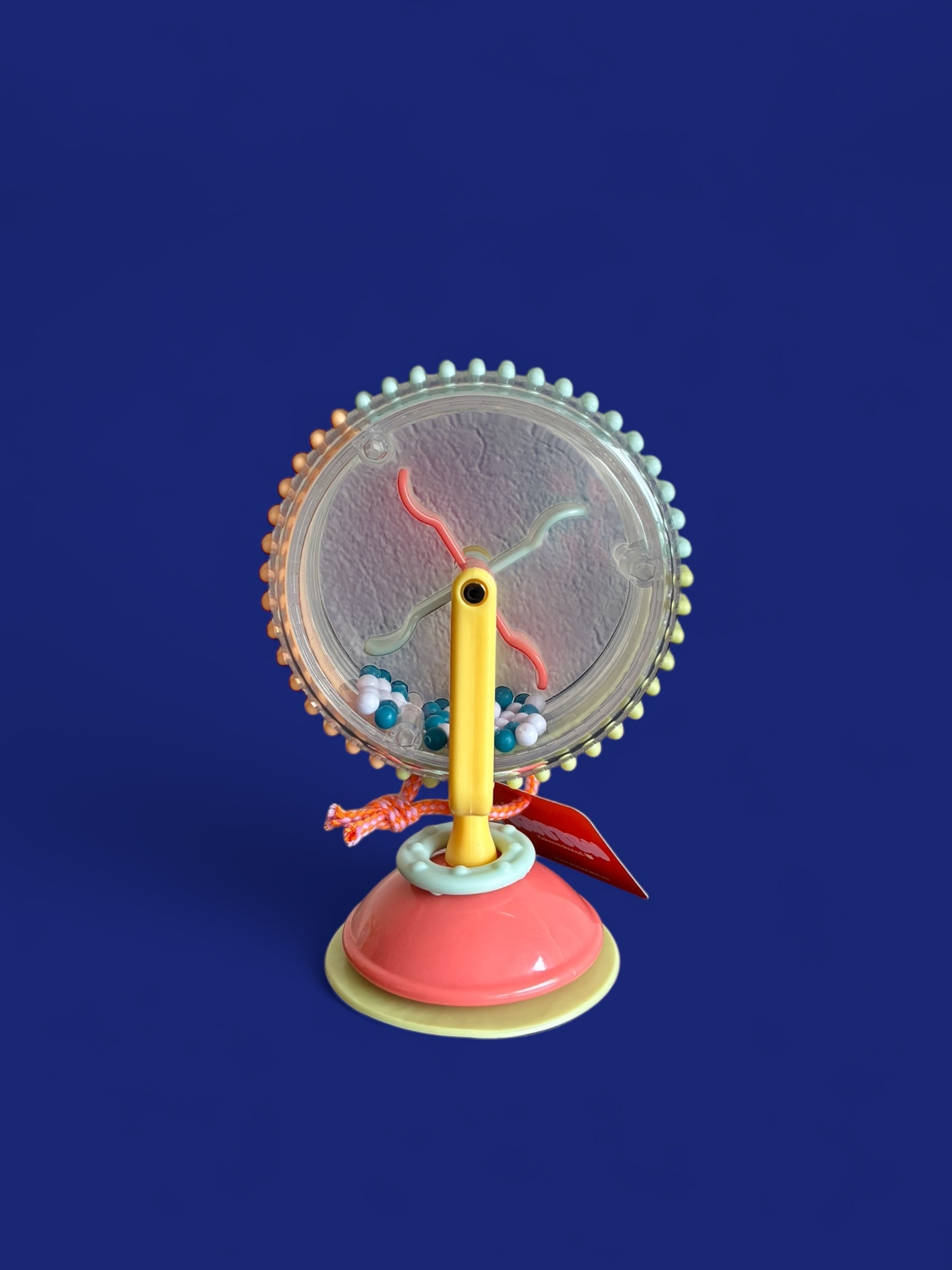 Denne morsomme bordleken fester du med sugekopp. Når den spinner ruller og rasler alle de små kulene i stor fart! Nydelige pastellfarger. Fra Wallmart.
