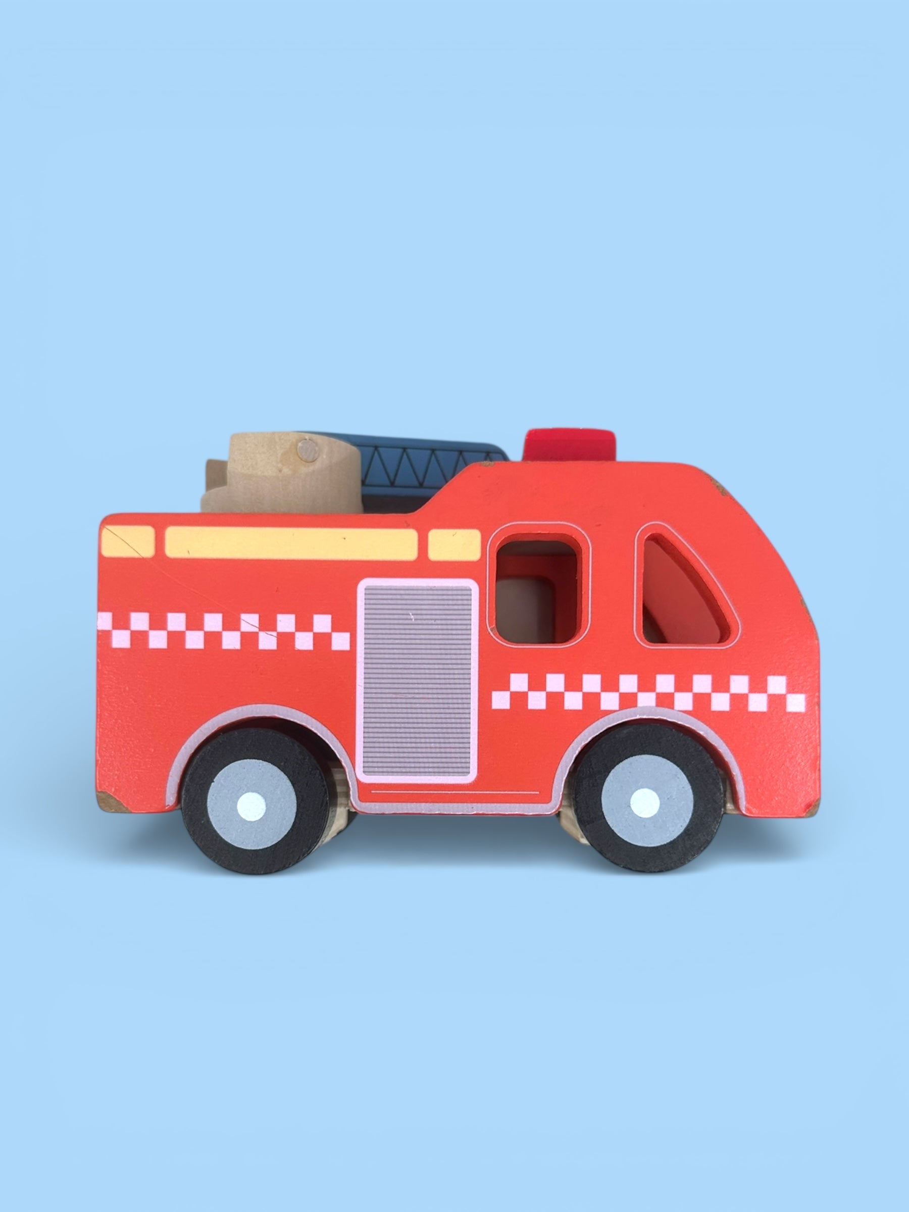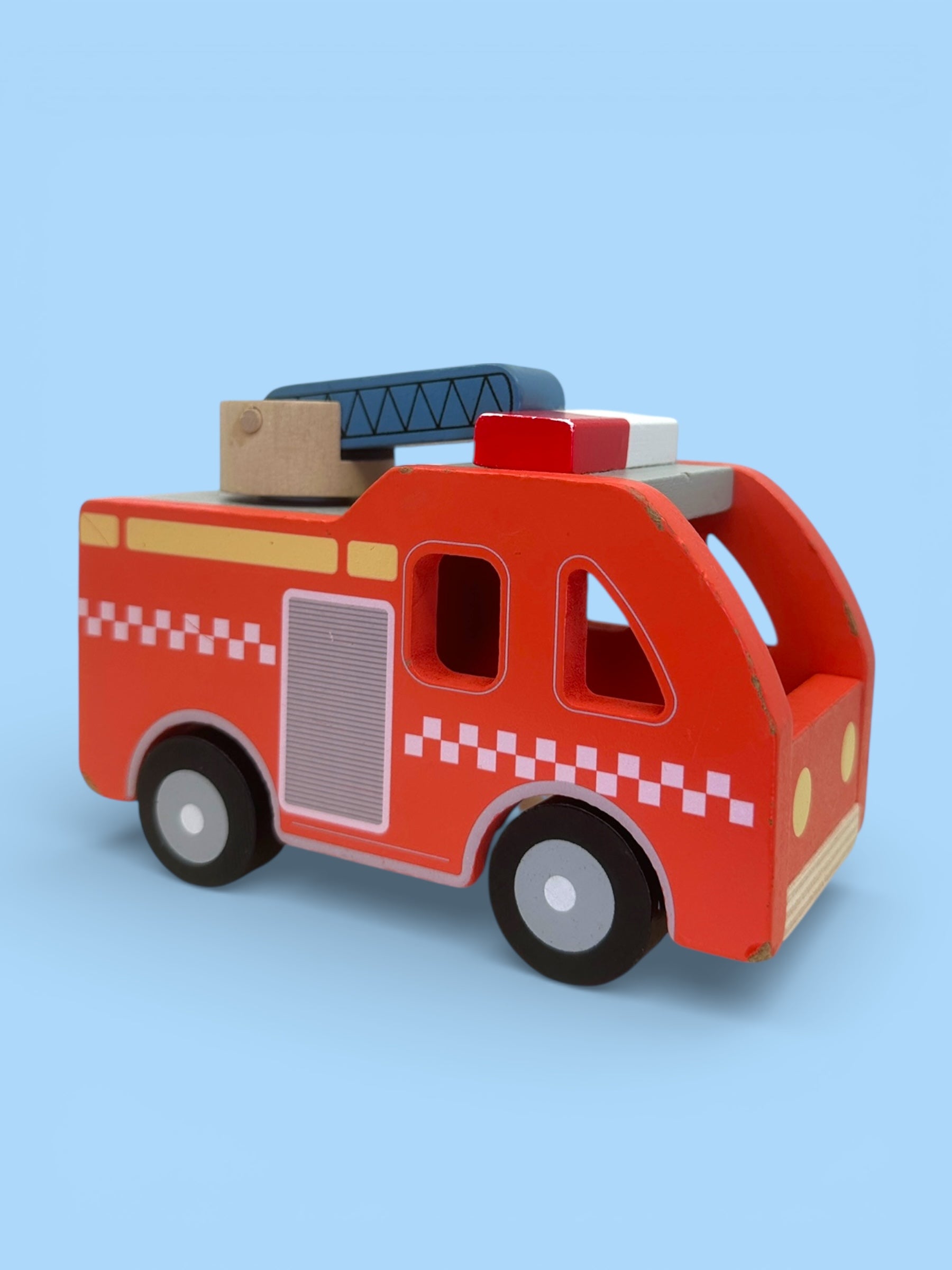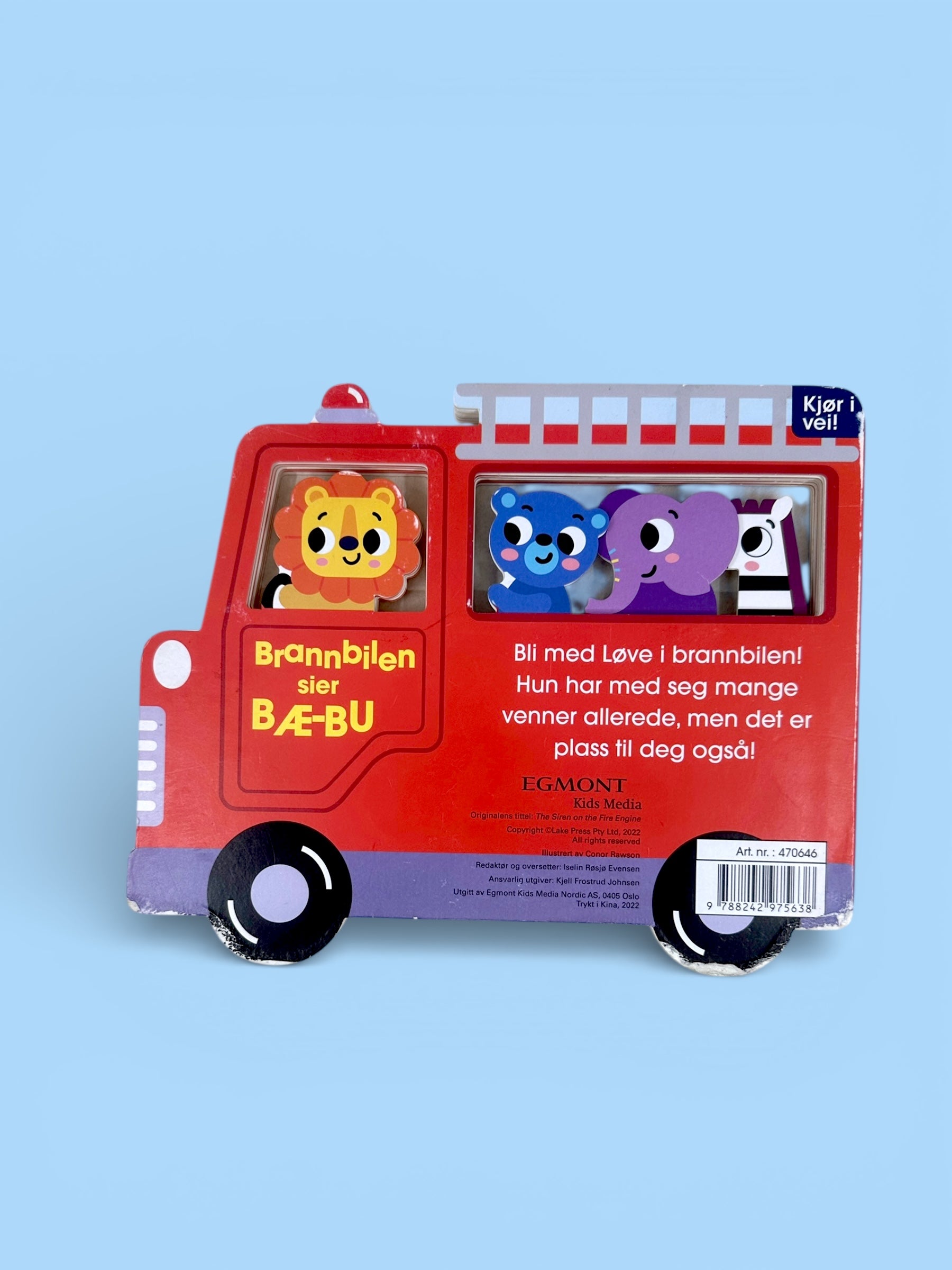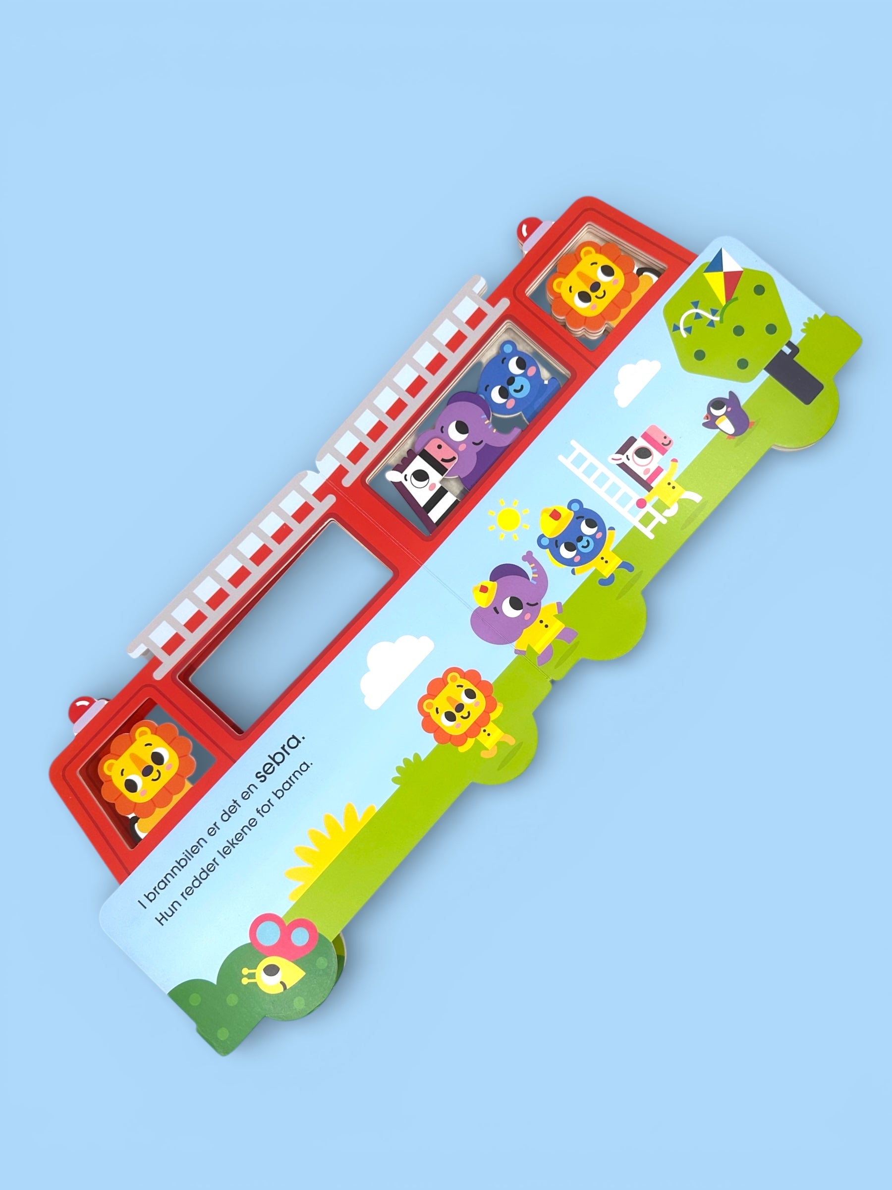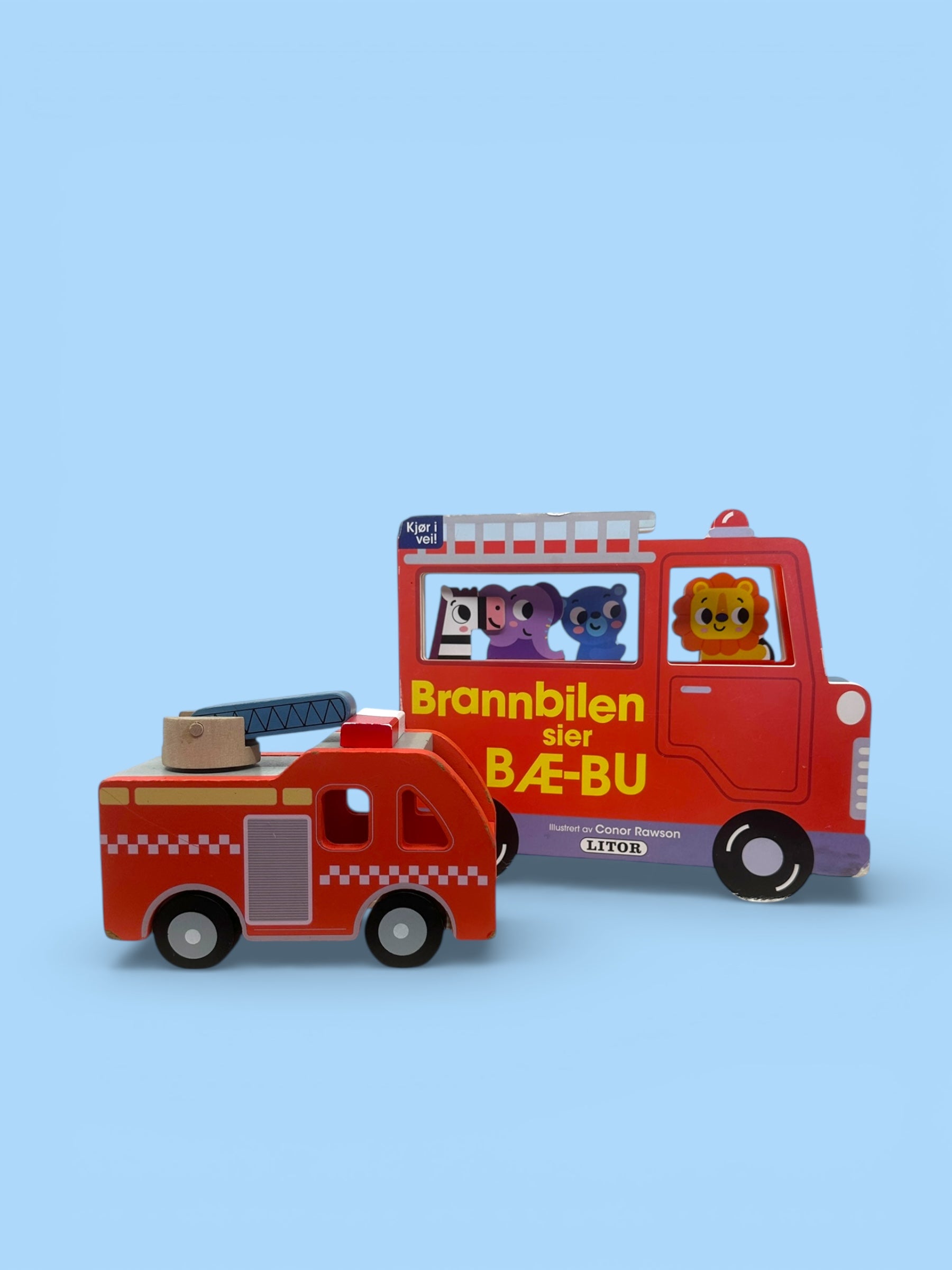 Bæææ-buuu! Denne brannbil-pakken passer for en liten brannmann (eller branndame)! Brannbilen er laget i tre og boken er i solid kartong. Som alle utrykkningskjøretøy har både boken og bilen litt bruksmerker i kantene, men de tåler en støyt!