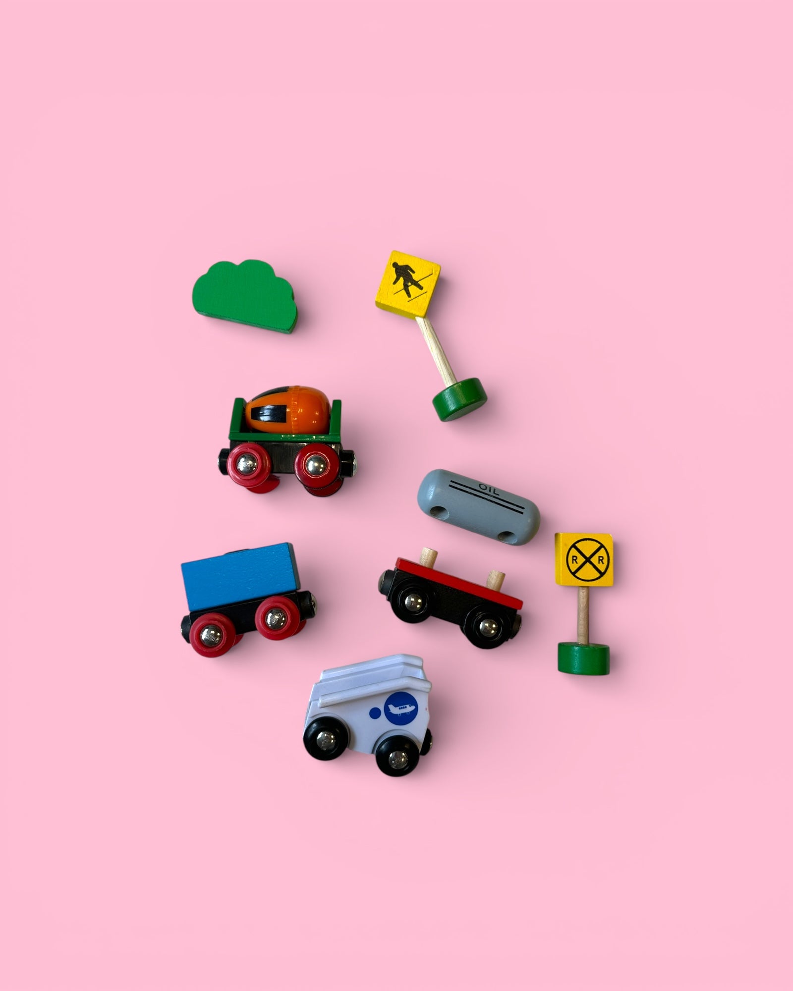 Et lite sett med spesialvogner fra Brio og et par skilt og en busk.