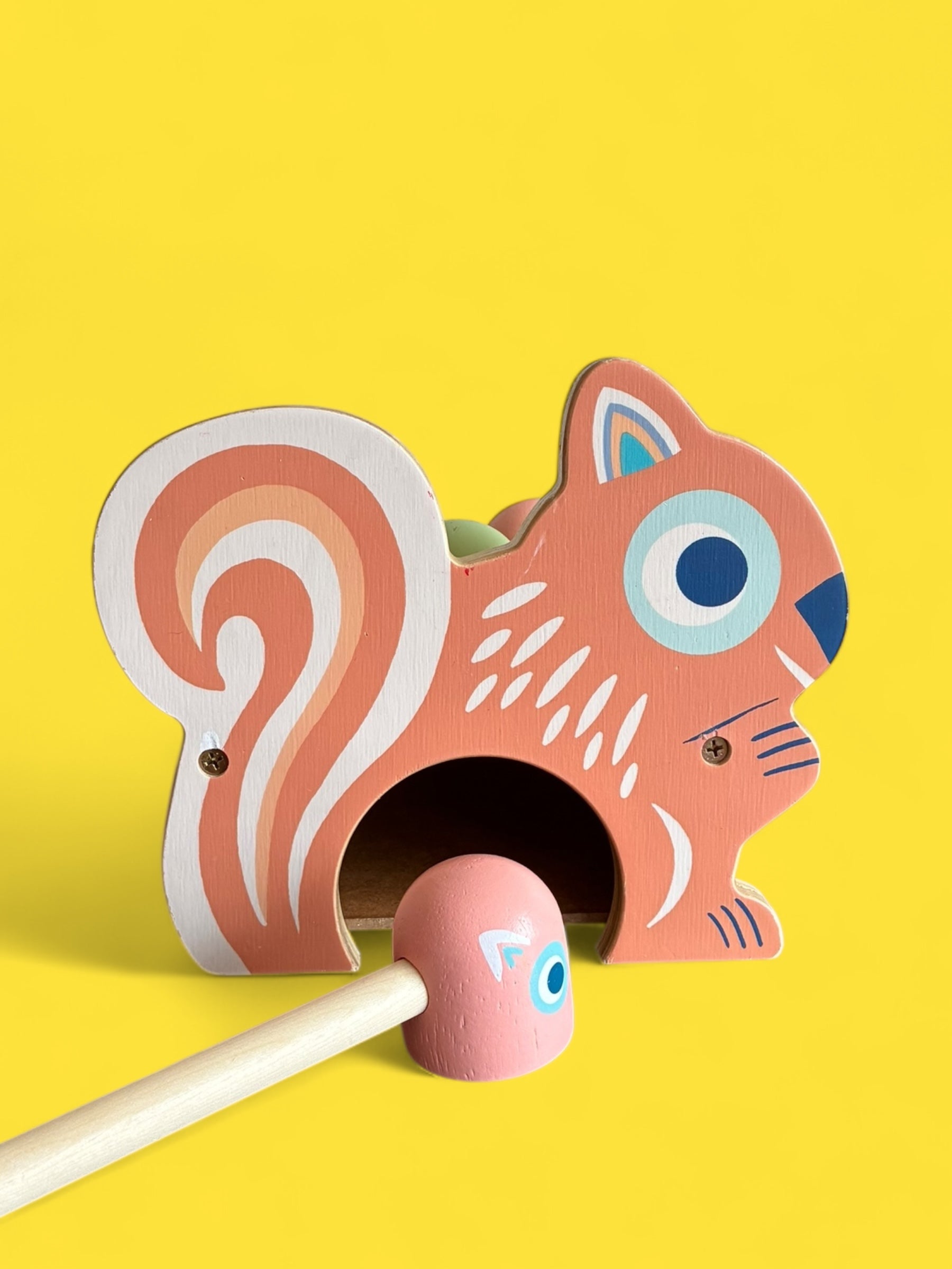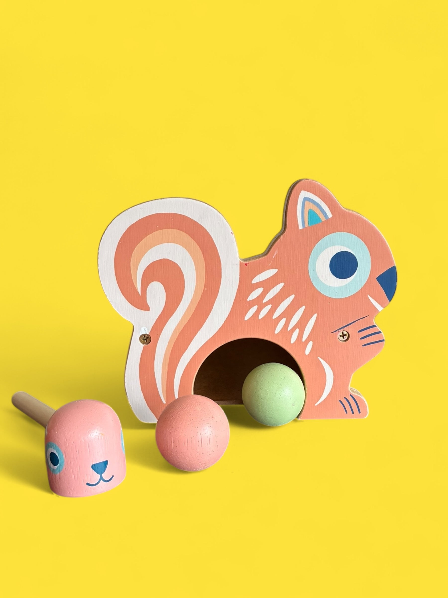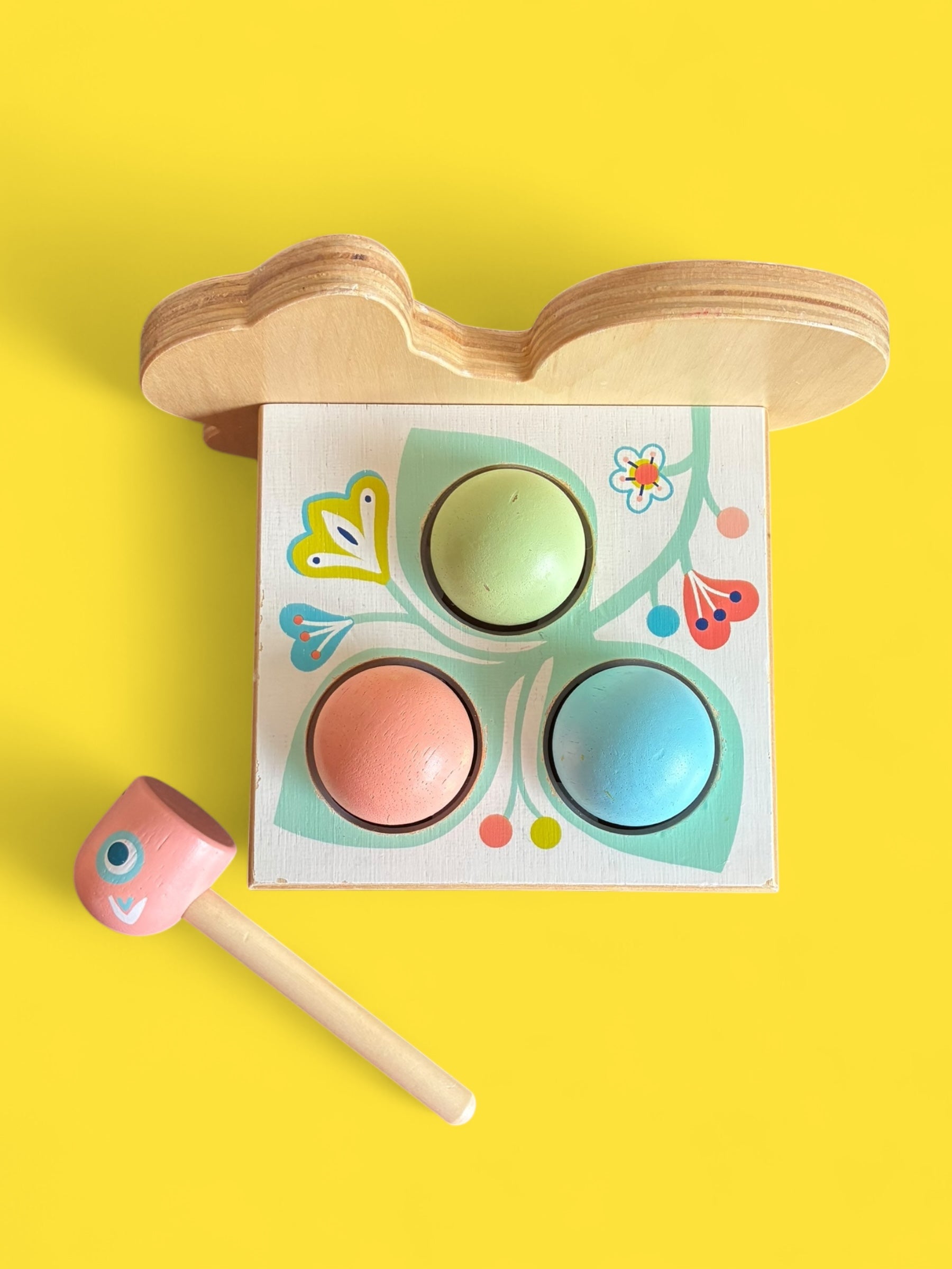 Et flott bankebrett i pastellfarger laget av tre. Det følger med tre kuler som slås med en hammer sånn at de ruller ned gjennom hullene.