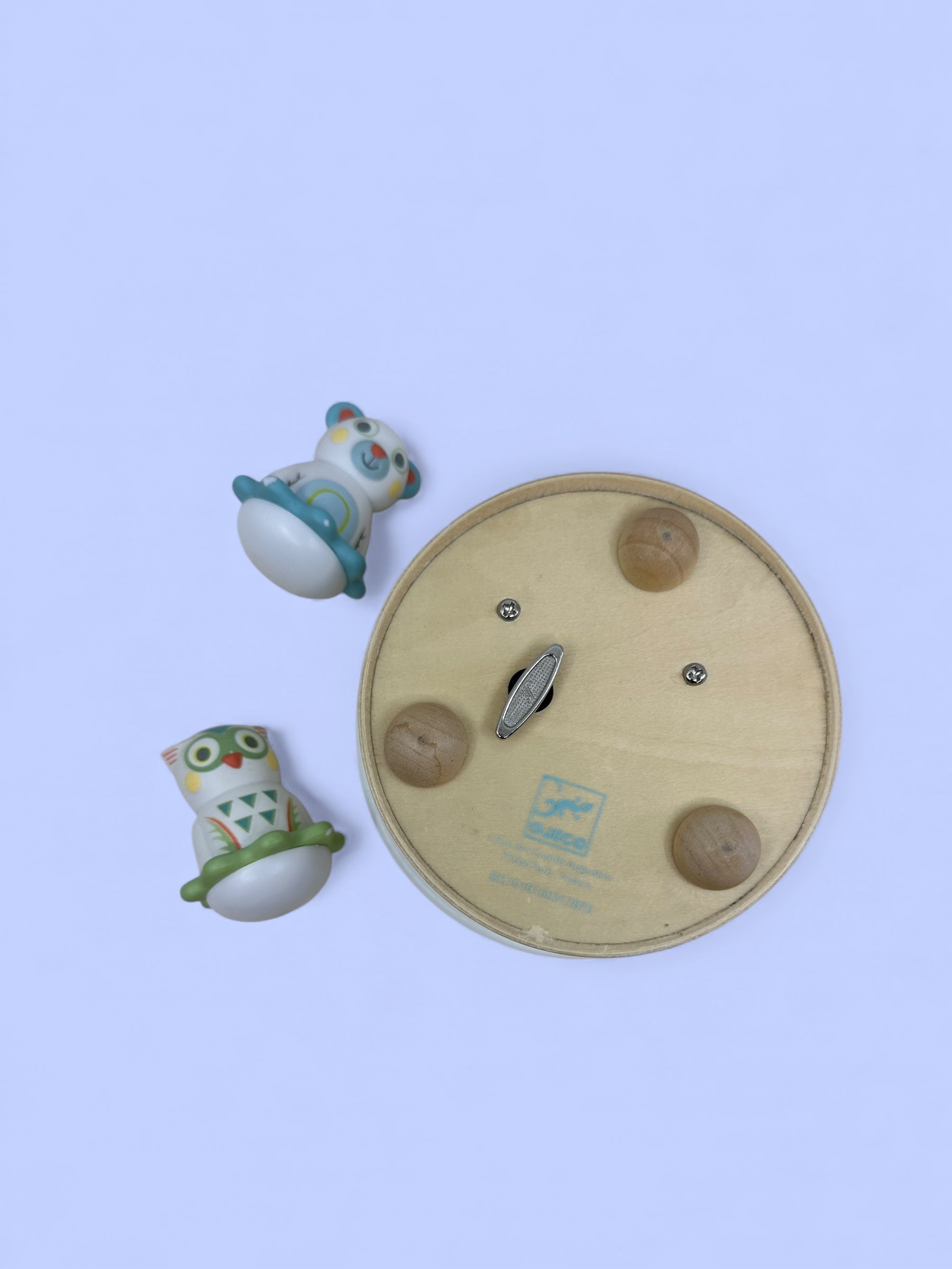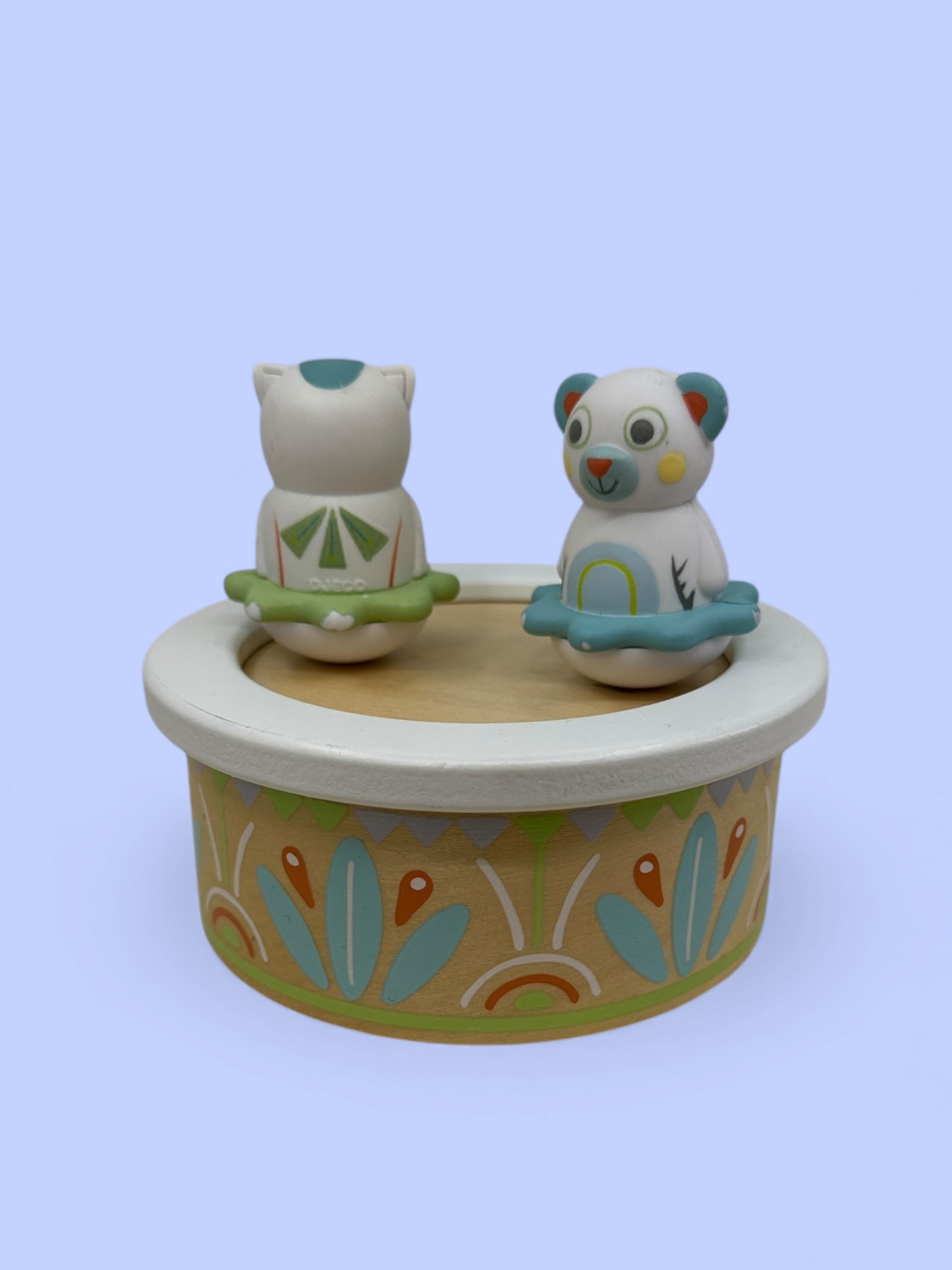 Nydelig og unik spilledåse i treverk med flotte, påmalte detaljer fra Djeco. Plasser uglen og bjørnen på toppflaten, trekk opp spilledåsen og se dyrene danse og snurre rundt på platen mens det spille koselig musikk. Fin som nattasang på sengekanten, men den tåler også å lekes med og er trygg for de aller minste.