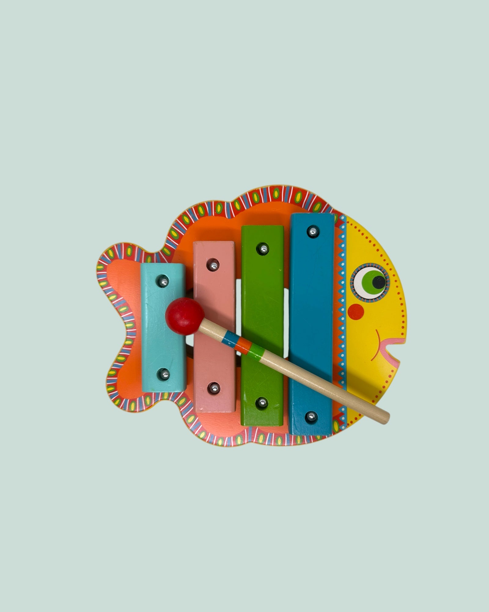 Morsom xylofon i malt treverk, formet som en glad og fargerik fisk! Bruk de medfølgende trepinnene for å spille på de fire ulike tonene. Et fint første instrument til de mindre barna!