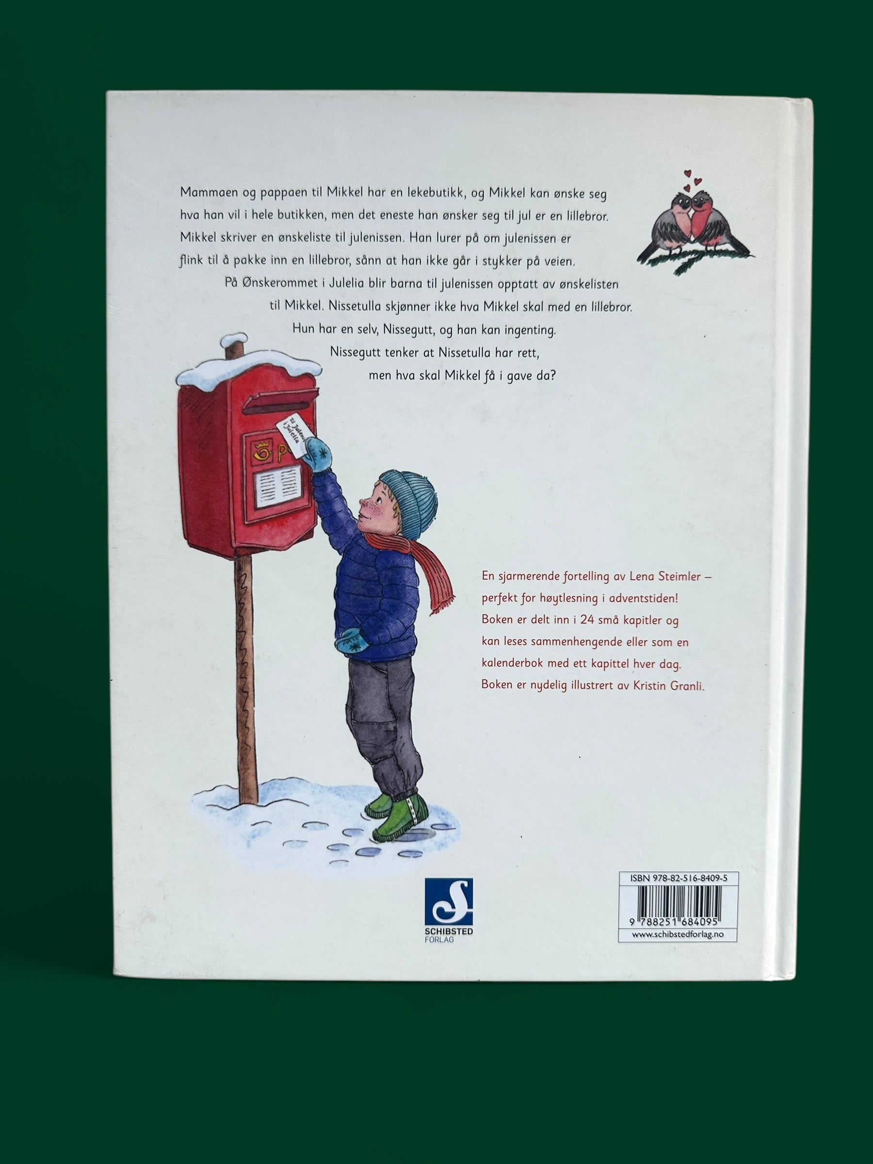 Mammaen og pappaen til Mikkel har en lekebutikk, og Mikkel kan ønske seg hva han vil i hele butikken til jul. Han ønsker seg en lillebror, og han håper at foreldrene har en på lageret. På Ønskerommet i Julelia blir barna til julenissen opptatt av ønskelisten til Mikkel. Nissetulla skjønner ikke hva Mikkel skal med en lillebror. Hun har en selv, Nissegutt, og han kan jo ingenting. Nissegutt tenker at Nissetulla har rett, men hva skal Mikkel få i gave da? Boken består av 24 små kapitler og er dermed en flott kalenderbok å kose seg med mens barna venter på jul.