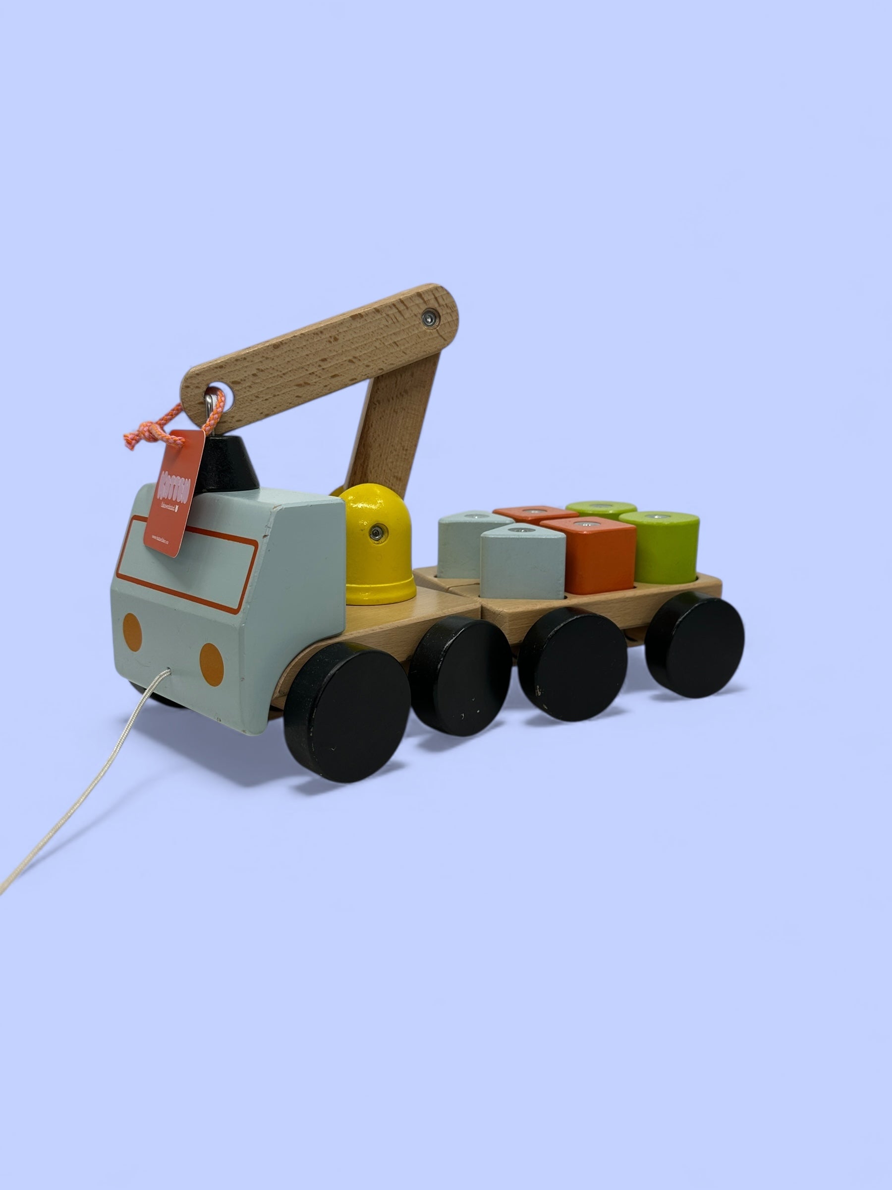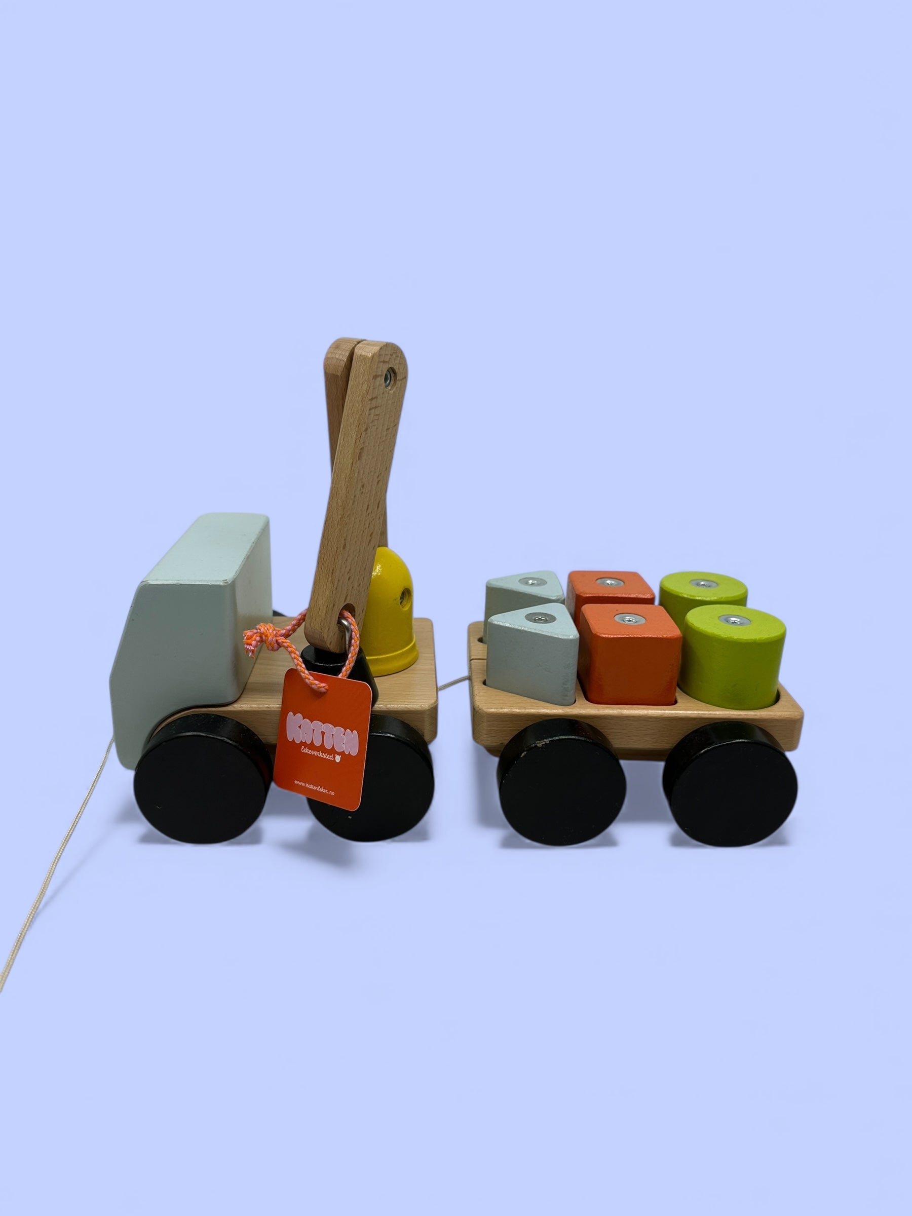 Denne kule kranbilen har med seg en henger full av last! Klossene kan løftes opp med magneten i kranen og du kan koble fra hengeren enkelt med bare tråden. Den har også et tau som gjør at du kan slepe bilen etter deg. Denne leken er laget i solid tre, en robust leke som kan lekes med i mange år fremover! Kommer i freshe farger!