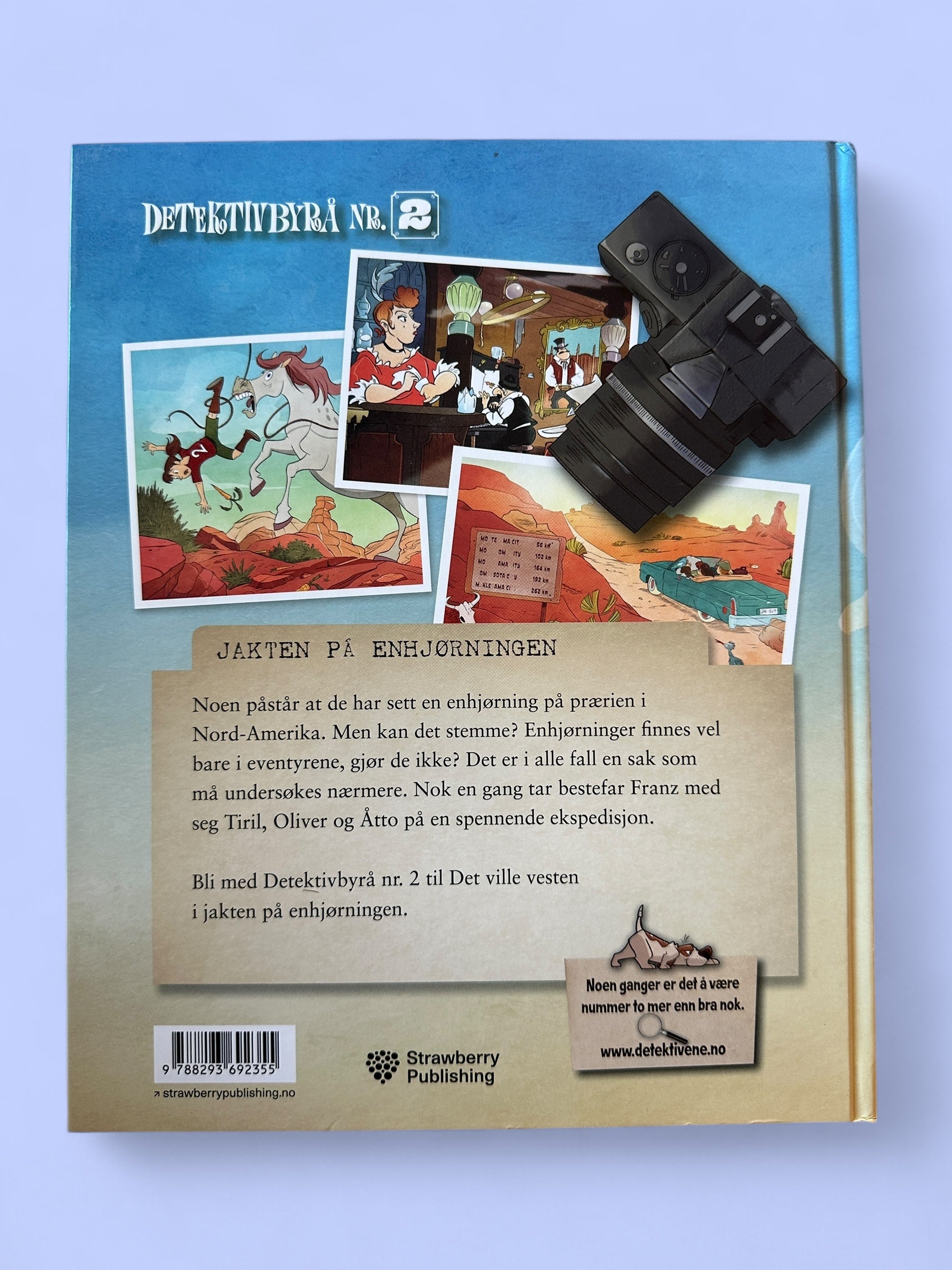 I Jakten på enhjørningen blir Tiril, Oliver og Åtto med bestefar Franz til Moklehoma City i USA, hvor noen påstår at de har sett en ekte enhjørning. Byen er full av trehus og det er cowboyer i gatene, akkurat som i det ville vesten i gamle dager. Presidenten i Det naturhistoriske selskapet har lovet en belønning på en million dollar til den som greier å fange enhjørningen. Men finnes det egentlig ekte enhjørninger? Det er utvilsomt en sak for detektivene, som rir ut på prærien for å komme til bunns i mysteriet. Snart viser det seg at de ikke er de eneste som er på jakt etter det spesielle dyret. På veien får vi være med Detektivbyrå nr. 2 og løse mysteriet, slik vi er vant med fra de andre «Jakten på»-bøkene. Bøkene om Detektivbyrå nr. 2 er en av Norges bestselgende barnebokserier gjennom tidene, med et opplag på hele 3 millioner bøker. Flere av dem er filmatisert, og det er også laget teaterforestilling basert på det populære universet. Jørn Lier Horst skriver spennende og virkelighetsnær krim fra den lille byen Elvestad. Hans Jørgen Sandnes utfyller fortellingene med sine fargerike og detaljerte illustrasjoner. I hovedrollene treffer vi barna Tiril og Oliver - og hunden Åtto - som samler bevis, leter etter sammenhenger og jakter på forbrytere. I 2022 ble de tre karakterene kåret til tidenes beste barnebok-karakterer av bransjenettstedet Bok 365.