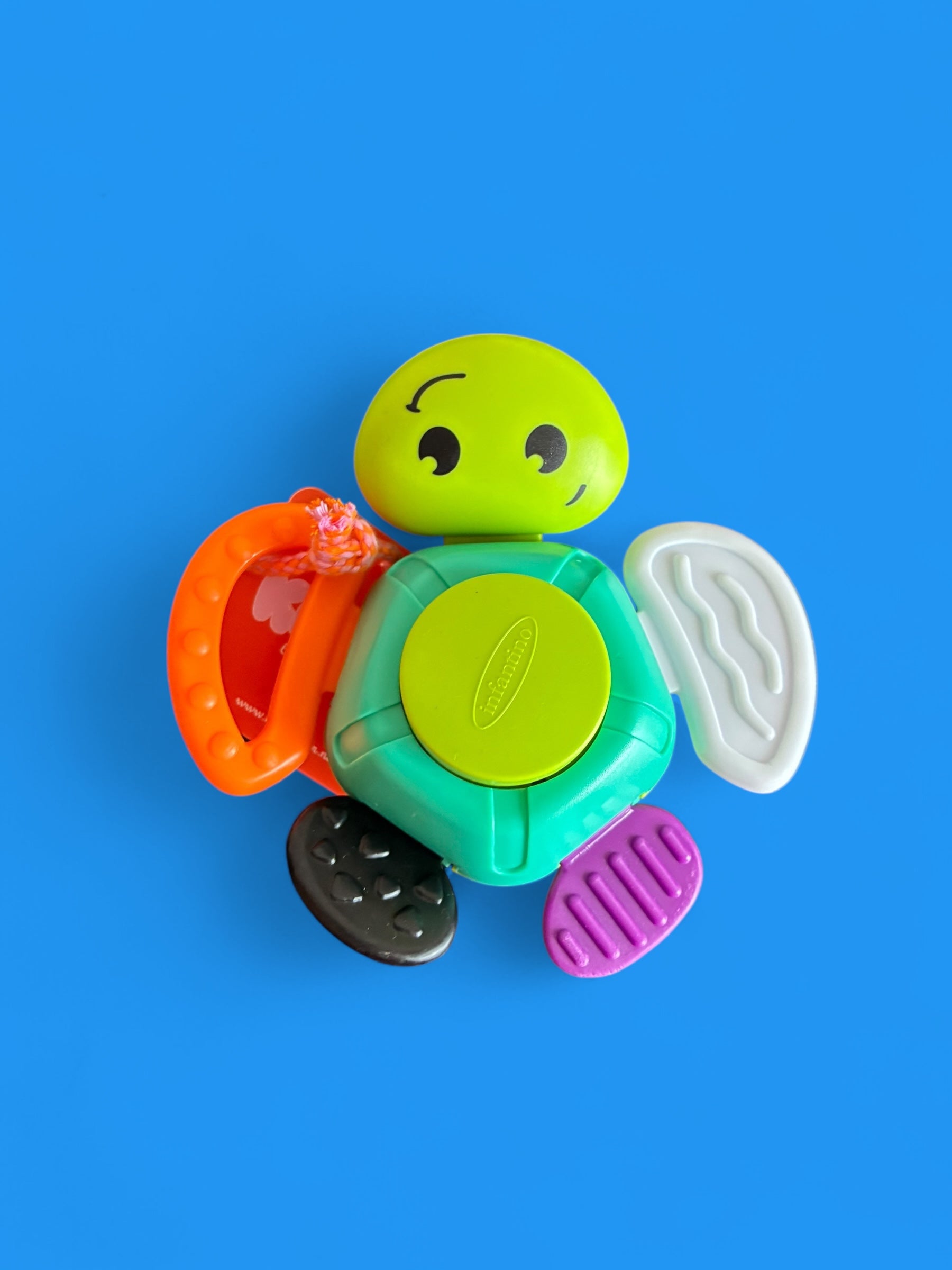 En morsom skilpadde-rangle som lager en innbydende klikkelyd og plystrelyd når den beveges. Skilpaddens finner kan roteres for ekstra interaktivitet, og den er designet for å gi taktil og kinestetisk stimulering. Den sikre håndtaket gjør den enkel å bære og perfekt for små utforskere.