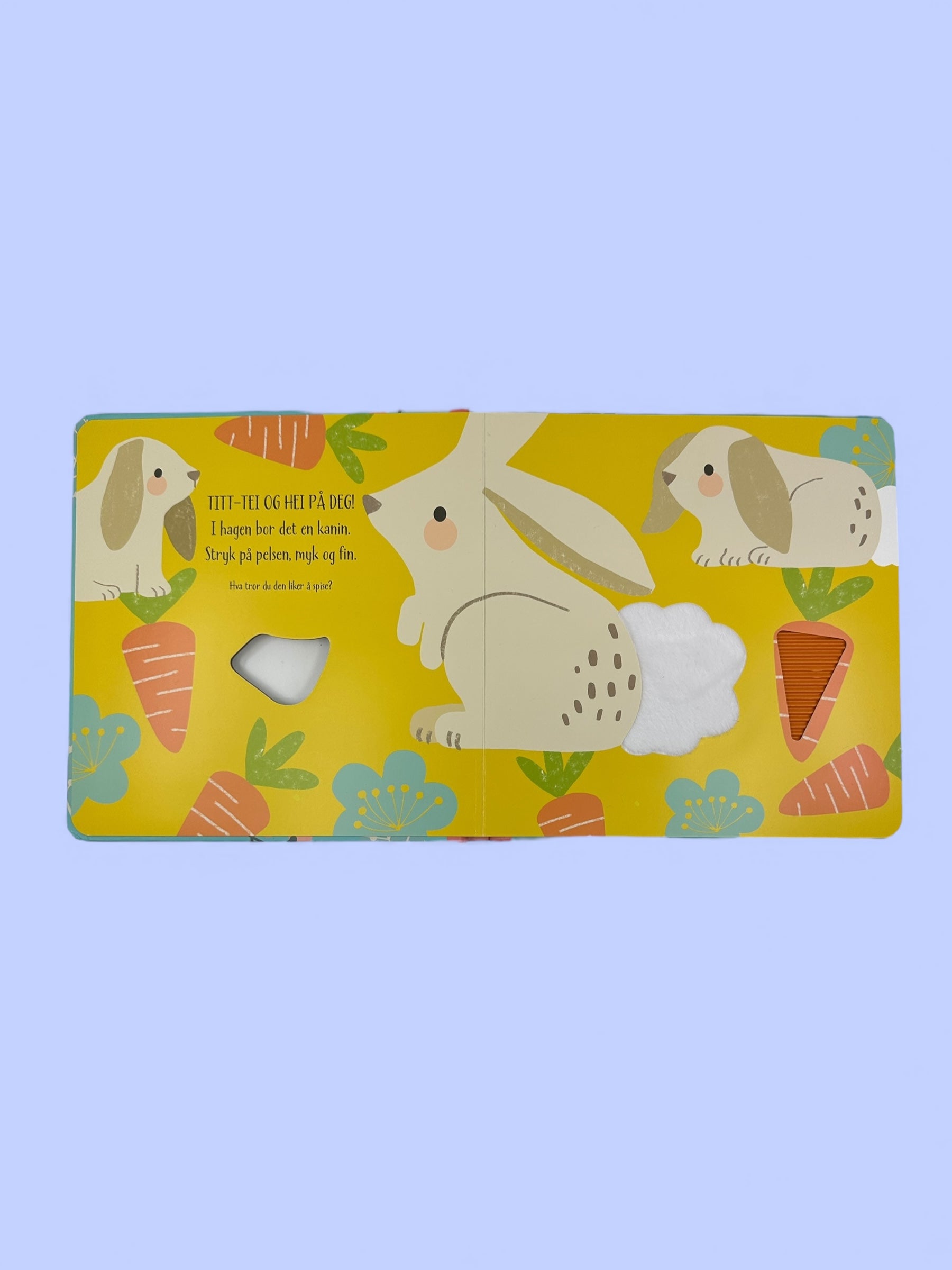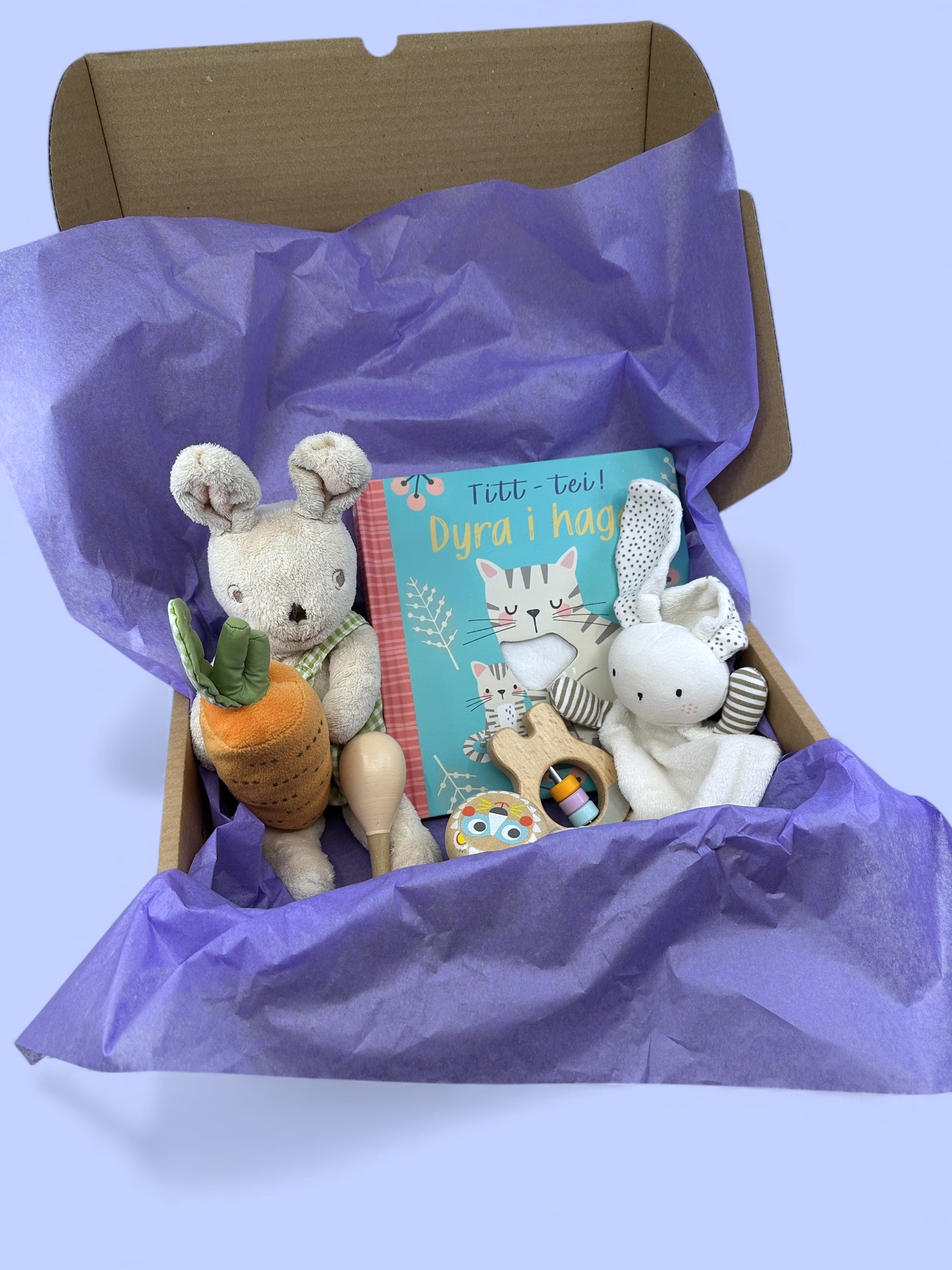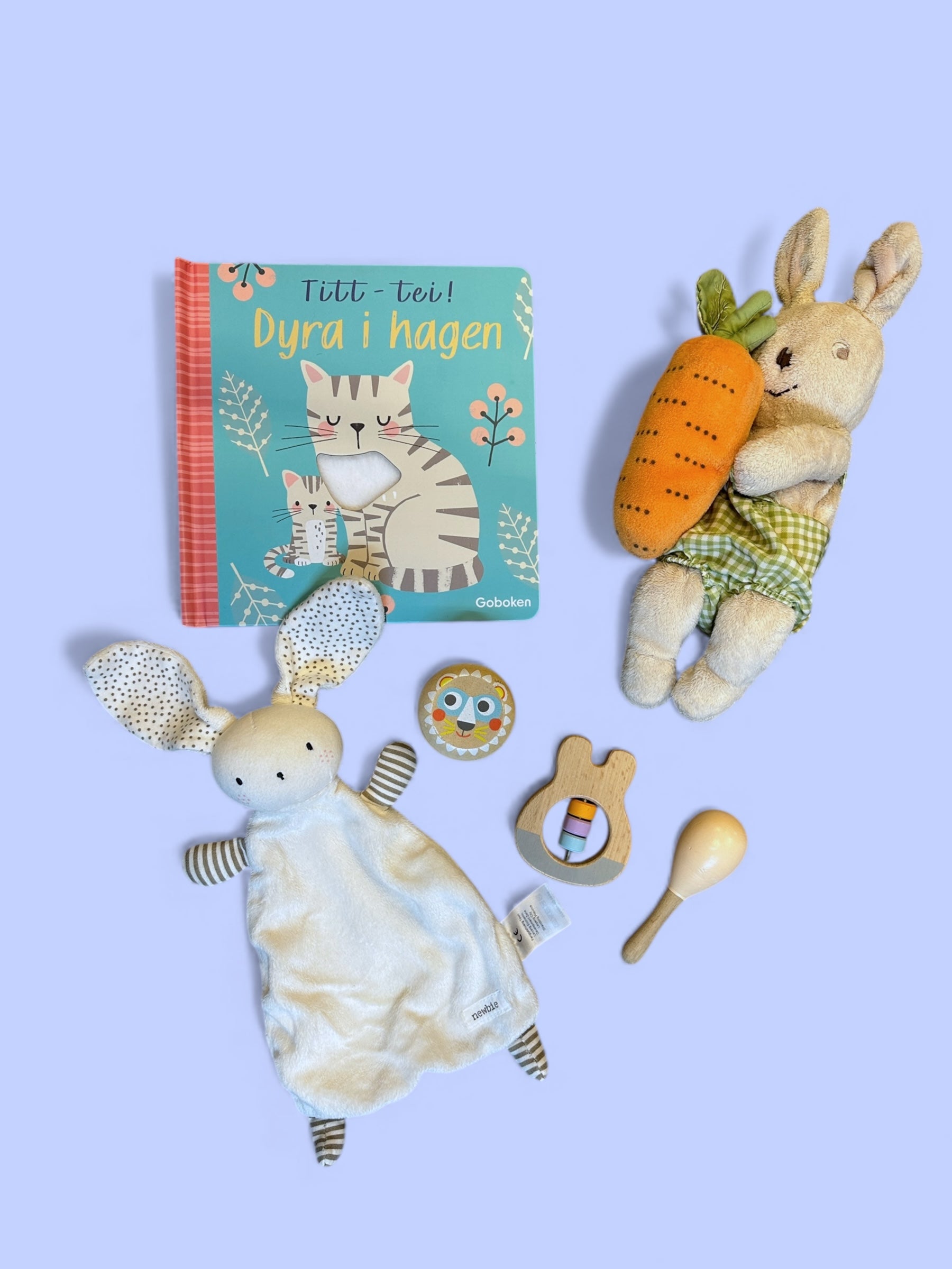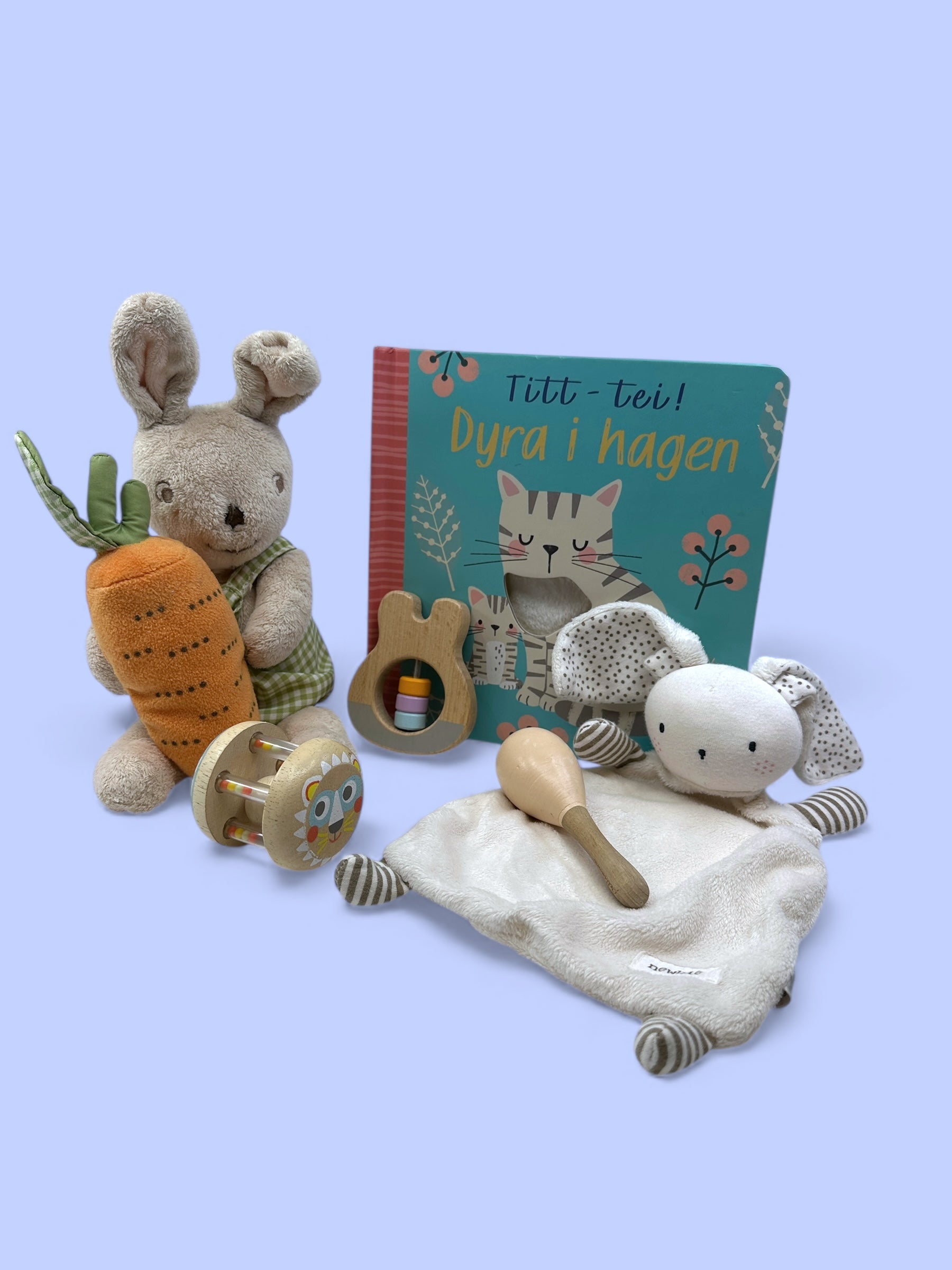 Denne skjønne pakken inneholder en søt kanin med bjelle inni seg, hun holder en gulrot og er klar for å leke i hagen! Med seg har hun en bok om alle dyra i hagen faktisk, om hva de gjør - og du kan ta på ulike overflater for sensorisk lek. Det følger med en liten treleke med kaninform, en maracas i tre og en myk koseklut fra newbie.