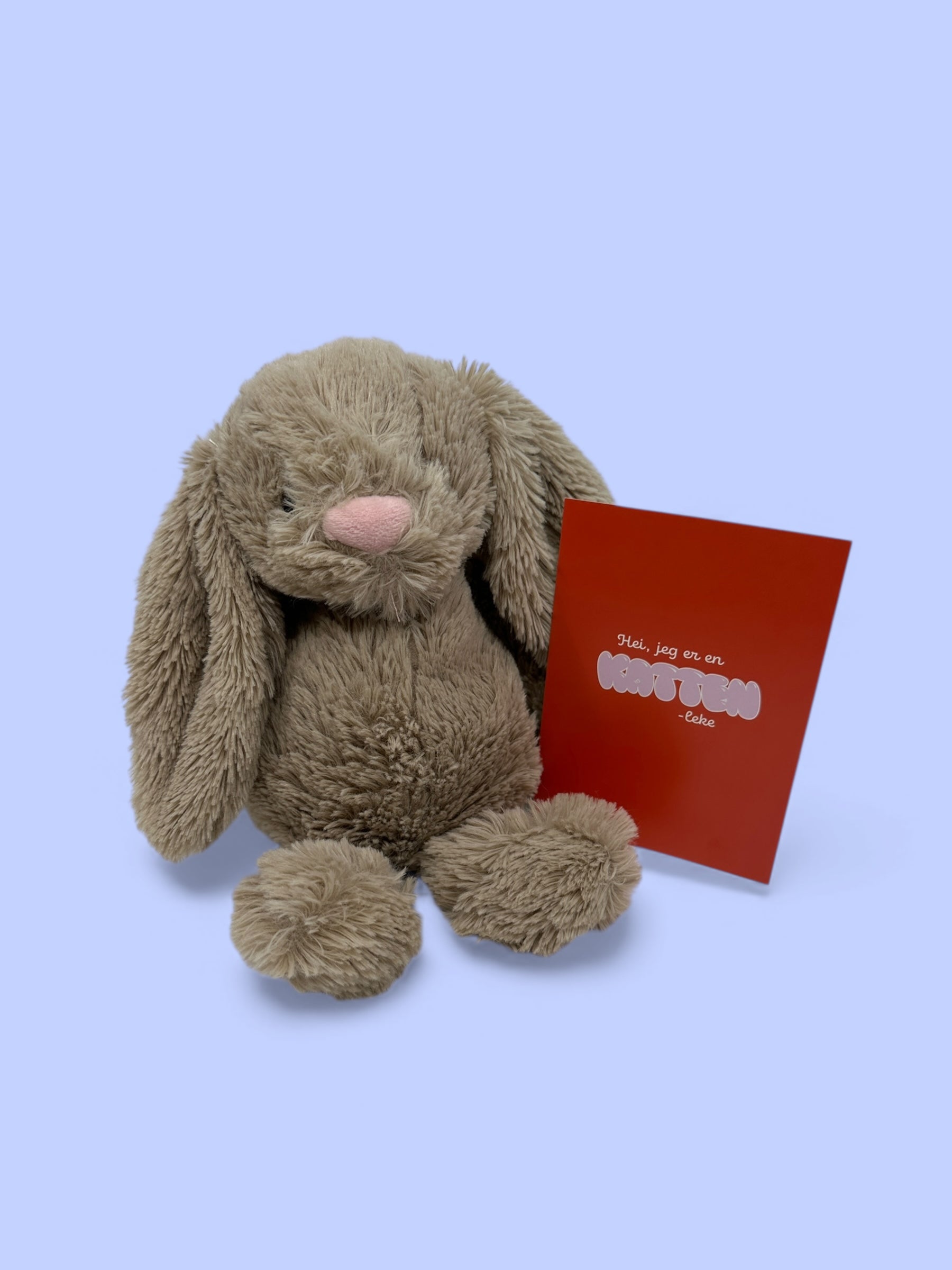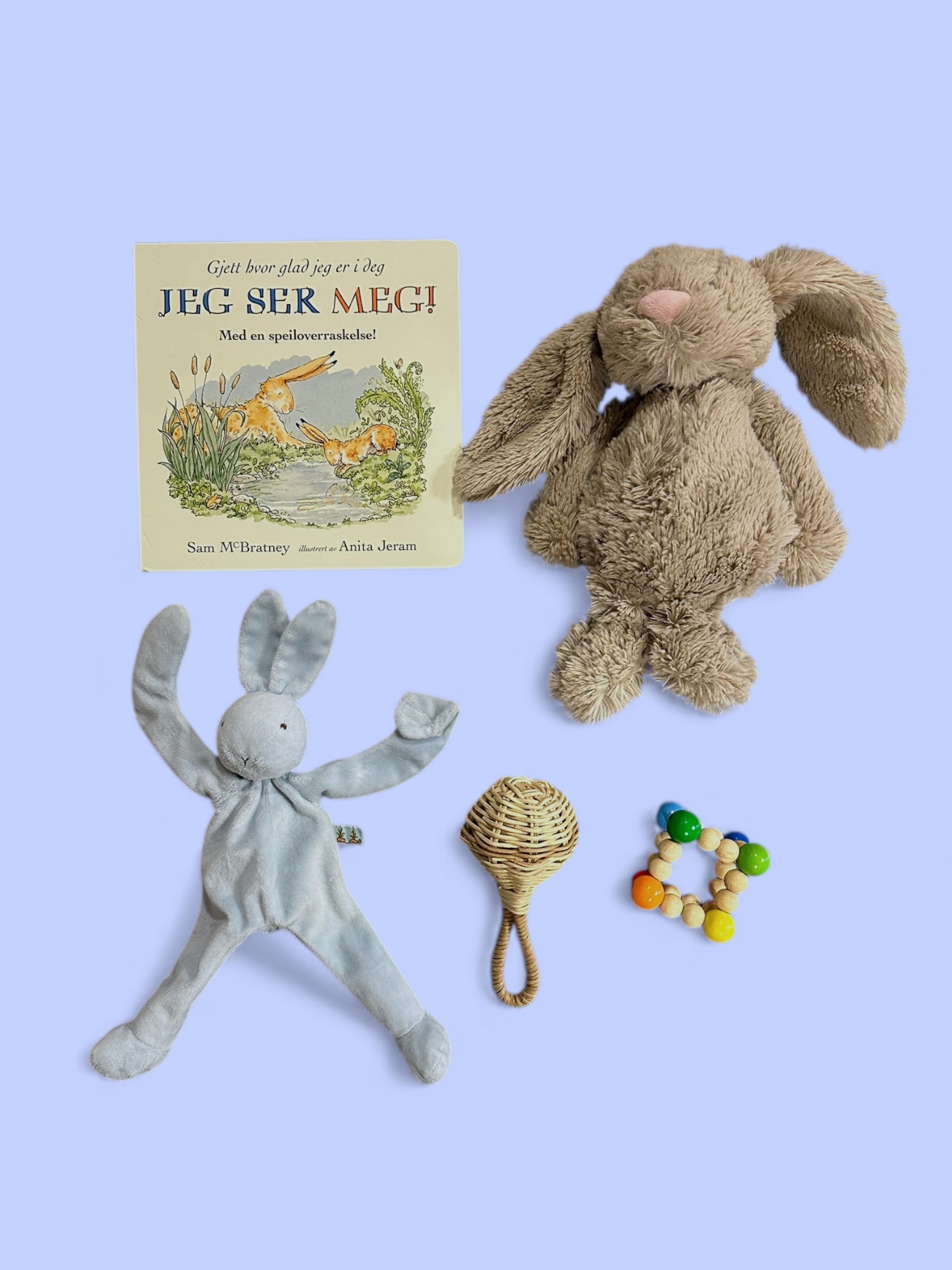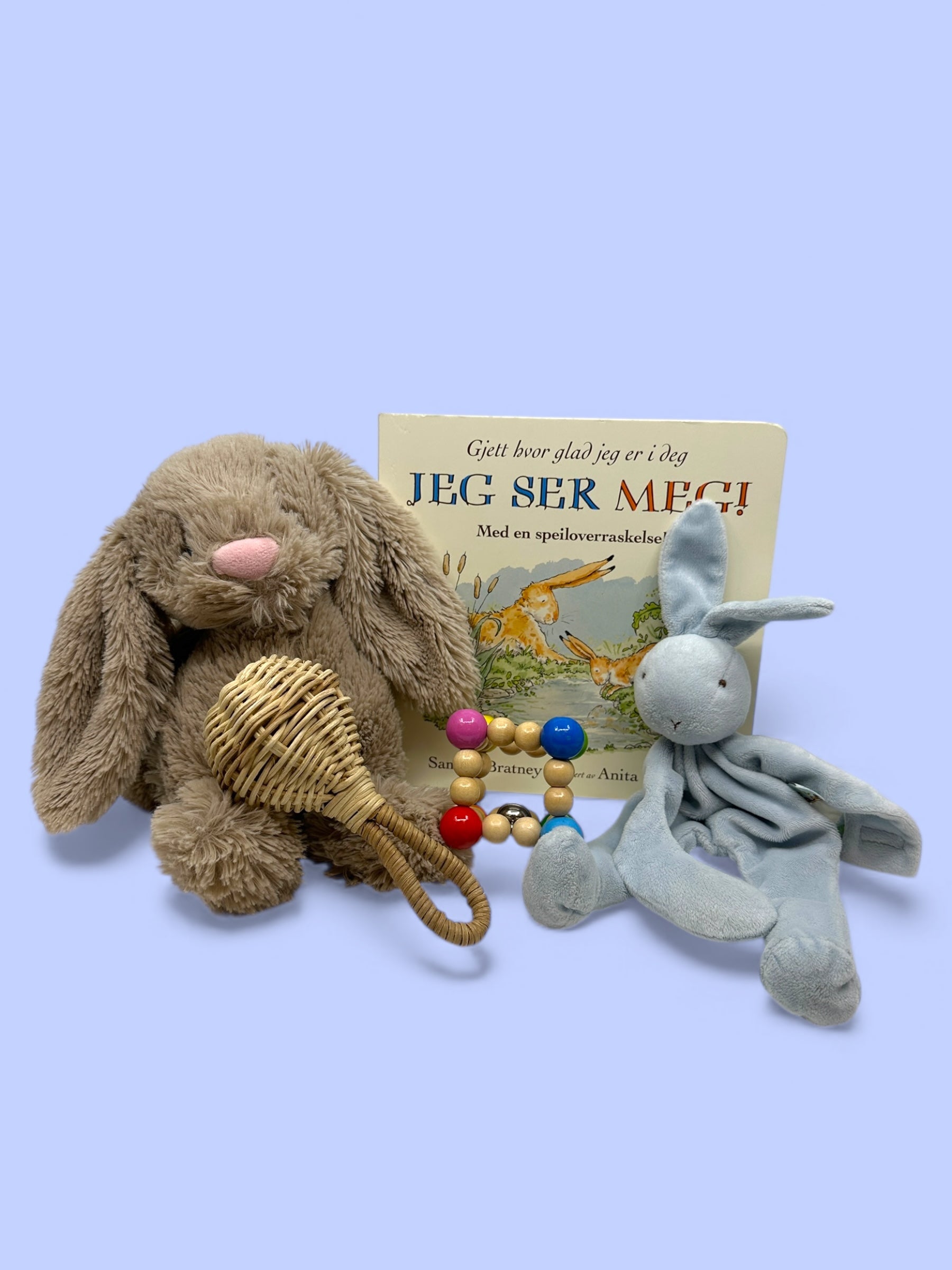 Denne nydelige pakken inneholder en kosekanin, en koseklut fra Bunnies by the bay, verdens nydeligste flettete rangle og en treleke med bjelle.