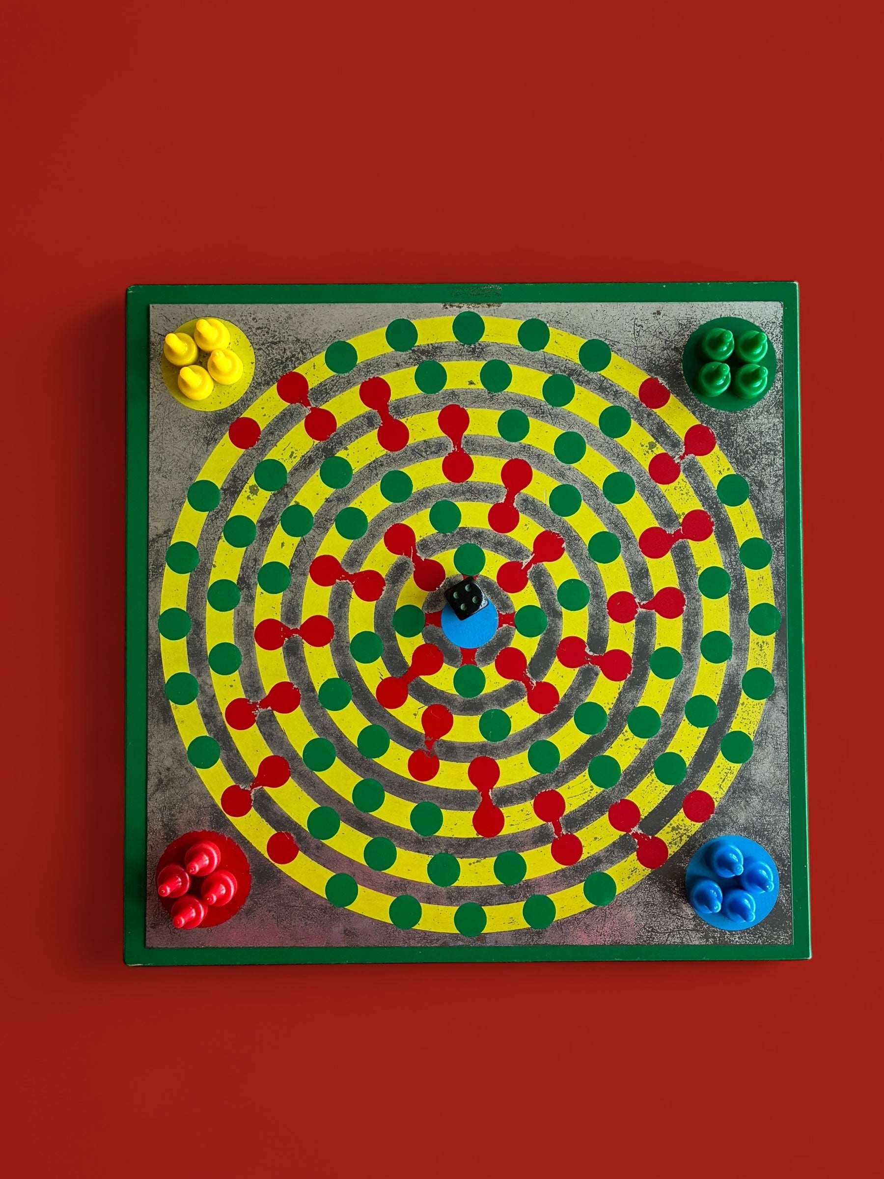 Dette gamle ludospillet kommer med en vri! Den er nemlig rund, og du skal gå i sirkel. Selvet spillbrettet er en tynn metallplate montert på en treplate. Spillbrikkene har magneter i seg og de sitter godt fast på spillbrettet. Boksen har mange tegn og merker etter et langt liv. Inneholder spillbrikker, terning, spillbrett og instruksjoner.