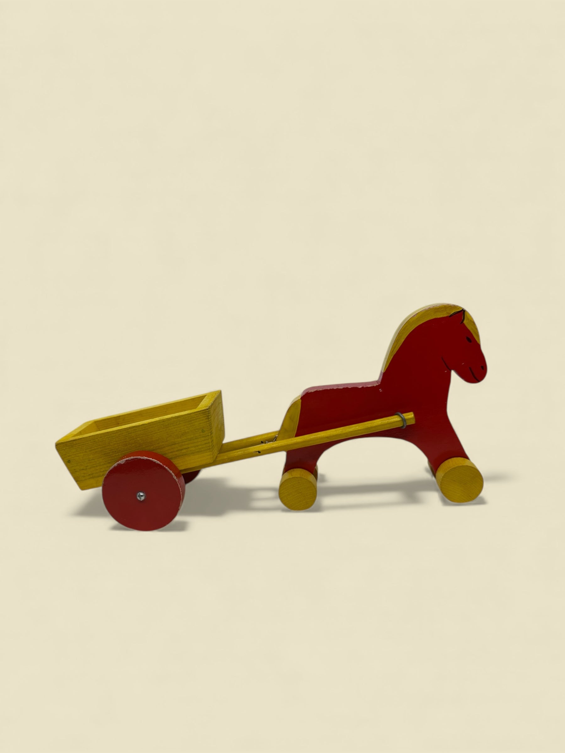 Denne nydelige treleken av en hest som drar en liten kjerre er en gammel skatt med masse lek i seg! Leken ruller og er den er laget av heltre.