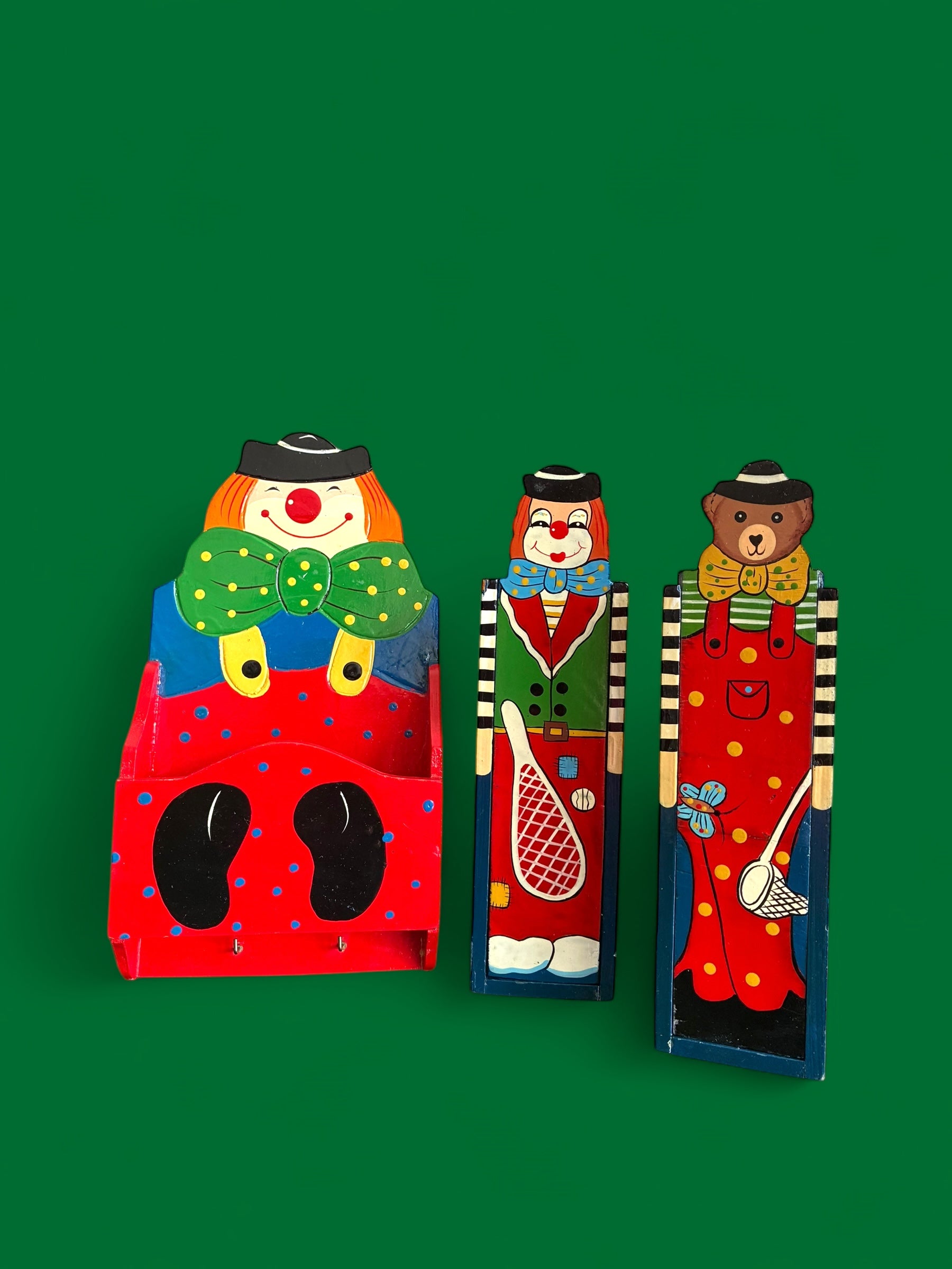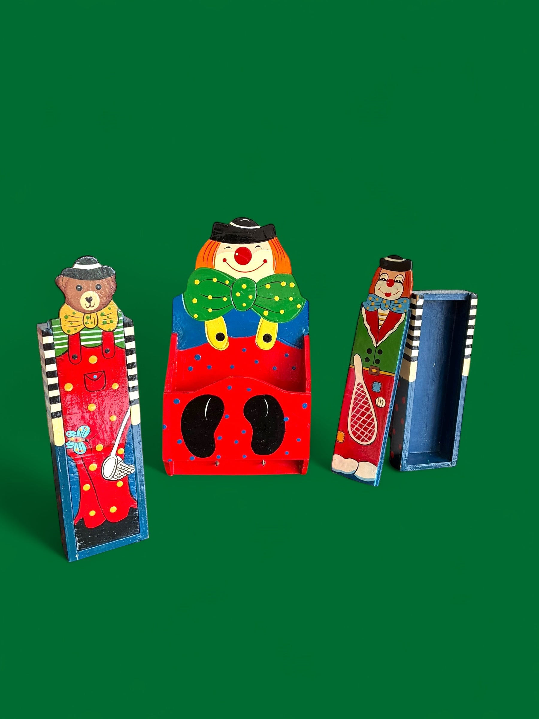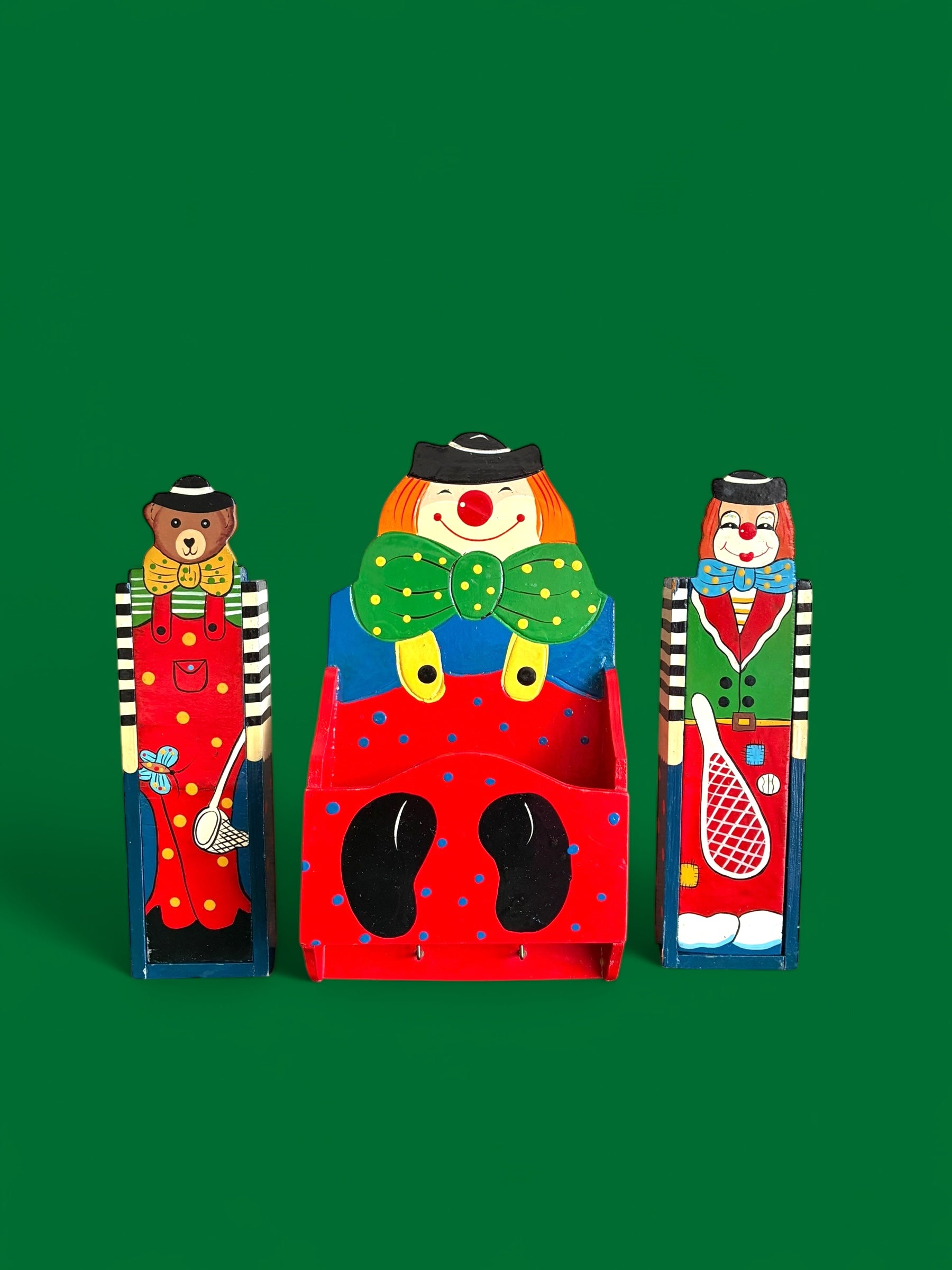 En herlig vintage trio! En klovnebrevholder med små kroker og oppheng, og to treesker som du kan bruke som pennal eller annen oppbevaring. En fargerik 90-tallsskatt!